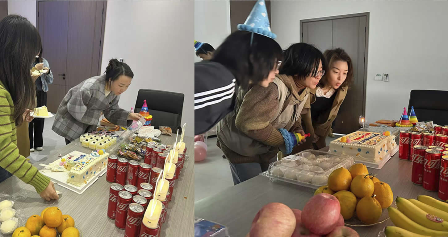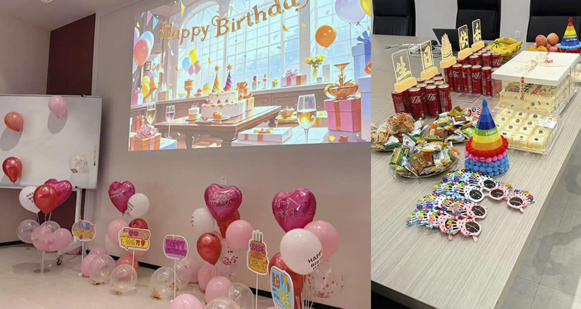 On the day of the event, colleagues from the Human Resources Department meticulously decorated the activity area. Colorful balloons outlined a vibrant and energetic space, while dazzling ribbons intertwined to create a warm and harmonious atmosphere. The walls were covered with tags filled with heartfelt wishes from colleagues, each word reflecting the camaraderie forged through working side by side. In the center of the activity area, a custom-made birthday cake adorned with exquisite decorations exuded a sweet fragrance. Surrounding it were neatly arranged fresh fruits and various snacks, which not only added to the sensory pleasure of the gathering but also fostered a cozy and romantic "big family" ambiance—a tangible expression of Lighting's corporate spirit of "caring for employees and uniting hearts," allowing every employee to feel the thoughtful care from the company amidst their busy work.